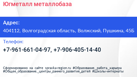 Югметалл, металлобаза по адресу 404112, Волгоградская область, Волжский, Пушкина, 45Б в дальнейшем Организация, размещена в следующих категориях: