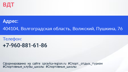 ВДТ по адресу 404104, Волгоградская область, Волжский, Пушкина, 76 в дальнейшем Организация, размещена в следующих категориях: