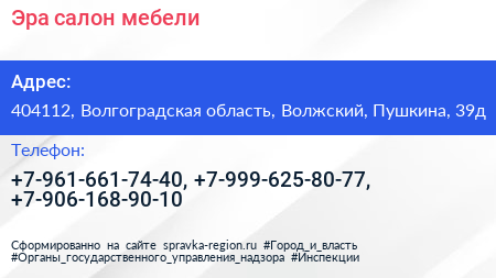 Эра, салон мебели по адресу 404112, Волгоградская область, Волжский, Пушкина, 39д в дальнейшем Организация, размещена в следующих категориях: