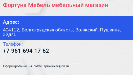 Фортуна Мебель, мебельный магазин по адресу 404112, Волгоградская область, Волжский, Пушкина, 39д/1 в дальнейшем Организация, размещена в следующих категориях: