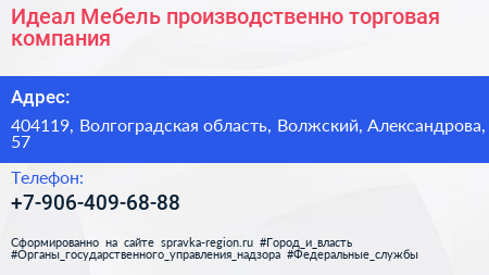 Идеал-Мебель, производственно-торговая компания по адресу 404119, Волгоградская область, Волжский, Александрова, 57 в дальнейшем Организация, размещена в следующих категориях: