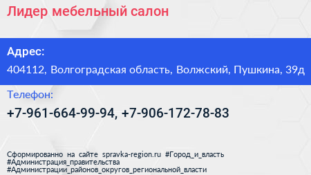 Лидер, мебельный салон по адресу 404112, Волгоградская область, Волжский, Пушкина, 39д в дальнейшем Организация, размещена в следующих категориях: