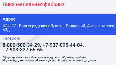 Лика, мебельная фабрика по адресу 404103, Волгоградская область, Волжский, Александрова, 63д в дальнейшем Организация, размещена в следующих категориях: