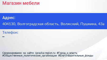 Магазин мебели по адресу 404130, Волгоградская область, Волжский, Пушкина, 43а в дальнейшем Организация, размещена в следующих категориях: