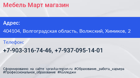 Мебель Март, магазин по адресу 404104, Волгоградская область, Волжский, Химиков, 2 в дальнейшем Организация, размещена в следующих категориях: