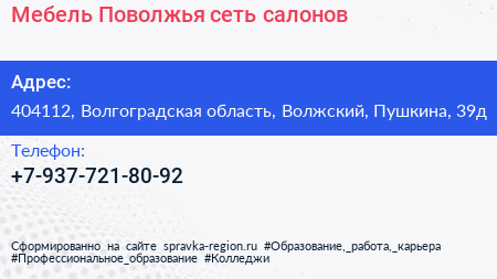 Мебель Поволжья, сеть салонов по адресу 404112, Волгоградская область, Волжский, Пушкина, 39д в дальнейшем Организация, размещена в следующих категориях: