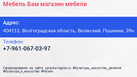 Мебель Вам, магазин мебели по адресу 404112, Волгоградская область, Волжский, Пушкина, 39н в дальнейшем Организация, размещена в следующих категориях: