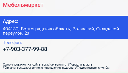 Мебельмаркет по адресу 404130, Волгоградская область, Волжский, Складской переулок, 2а в дальнейшем Организация, размещена в следующих категориях:
