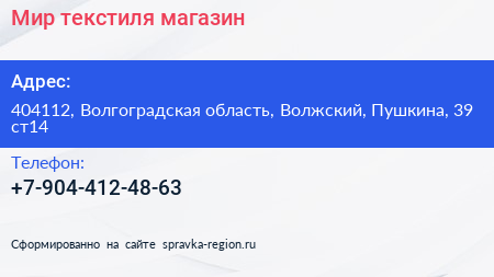 Мир текстиля, магазин по адресу 404112, Волгоградская область, Волжский, Пушкина, 39 ст14 в дальнейшем Организация, размещена в следующих категориях: