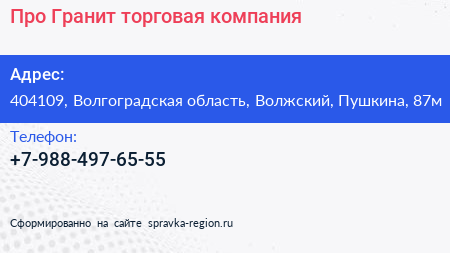Про-Гранит, торговая компания по адресу 404109, Волгоградская область, Волжский, Пушкина, 87м в дальнейшем Организация, размещена в следующих категориях: