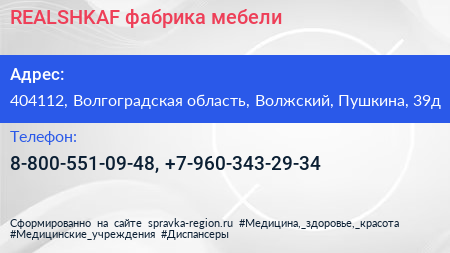 REALSHKAF, фабрика мебели по адресу 404112, Волгоградская область, Волжский, Пушкина, 39д в дальнейшем Организация, размещена в следующих категориях: