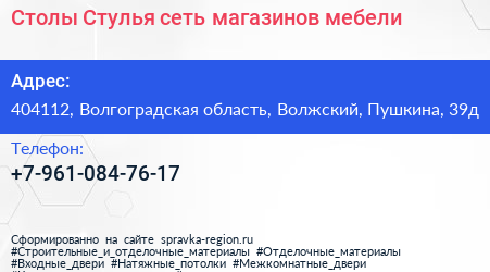 Столы Стулья, сеть магазинов мебели по адресу 404112, Волгоградская область, Волжский, Пушкина, 39д в дальнейшем Организация, размещена в следующих категориях: