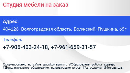 Студия мебели на заказ по адресу 404126, Волгоградская область, Волжский, Пушкина, 65г в дальнейшем Организация, размещена в следующих категориях: