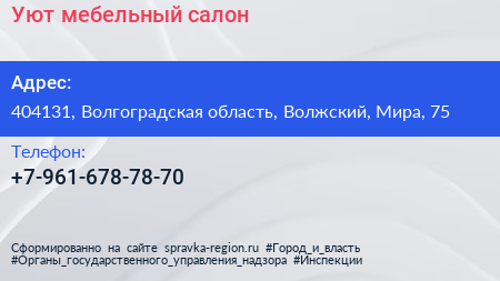 Уют, мебельный салон по адресу 404131, Волгоградская область, Волжский, Мира, 75 в дальнейшем Организация, размещена в следующих категориях: