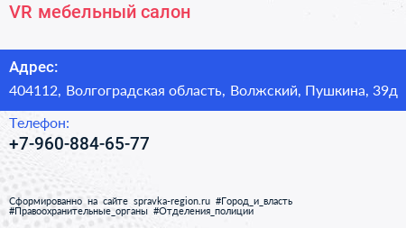 VR, мебельный салон по адресу 404112, Волгоградская область, Волжский, Пушкина, 39д в дальнейшем Организация, размещена в следующих категориях: