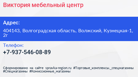 Виктория, мебельный центр по адресу 404143, Волгоградская область, Волжский, Кузнецкая-1, 2г в дальнейшем Организация, размещена в следующих категориях: