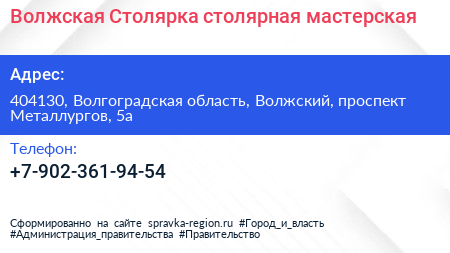 Волжская Столярка, столярная мастерская по адресу 404130, Волгоградская область, Волжский, проспект Металлургов, 5а в дальнейшем Организация, размещена в следующих категориях: