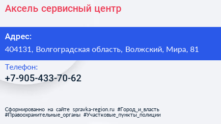 Аксель, сервисный центр по адресу 404131, Волгоградская область, Волжский, Мира, 81 в дальнейшем Организация, размещена в следующих категориях:
