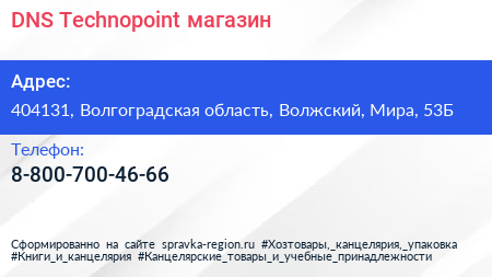 DNS Technopoint, магазин по адресу 404131, Волгоградская область, Волжский, Мира, 53Б в дальнейшем Организация, размещена в следующих категориях: