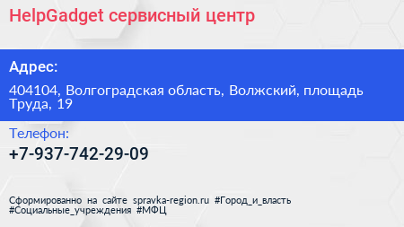 HelpGadget, сервисный центр по адресу 404104, Волгоградская область, Волжский, площадь Труда, 19 в дальнейшем Организация, размещена в следующих категориях: