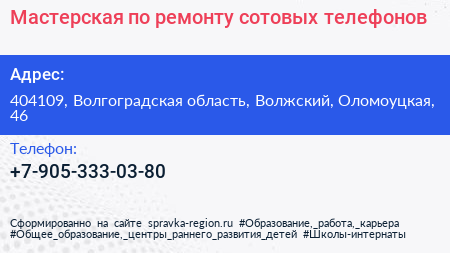 Мастерская по ремонту сотовых телефонов по адресу 404109, Волгоградская область, Волжский, Оломоуцкая, 46 в дальнейшем Организация, размещена в следующих категориях: