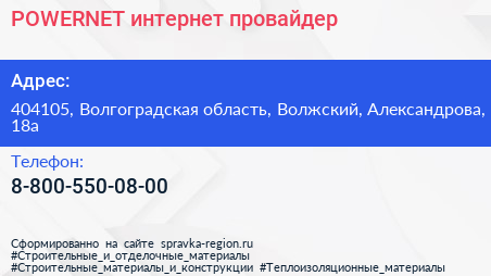 POWERNET, интернет-провайдер по адресу 404105, Волгоградская область, Волжский, Александрова, 18а в дальнейшем Организация, размещена в следующих категориях: