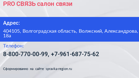 PRO СВЯЗЬ, салон связи по адресу 404105, Волгоградская область, Волжский, Александрова, 18а в дальнейшем Организация, размещена в следующих категориях: