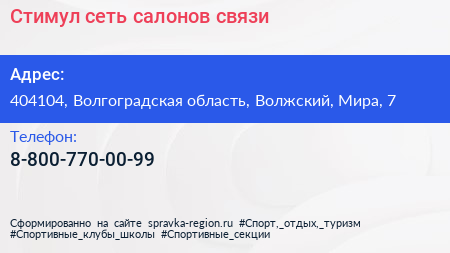 Стимул, сеть салонов связи по адресу 404104, Волгоградская область, Волжский, Мира, 7 в дальнейшем Организация, размещена в следующих категориях: