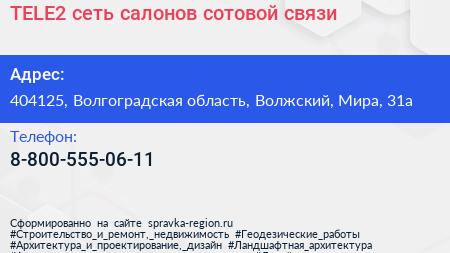 TELE2, сеть салонов сотовой связи по адресу 404125, Волгоградская область, Волжский, Мира, 31а в дальнейшем Организация, размещена в следующих категориях: