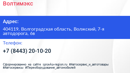 Волтимэкс по адресу 404119, Волгоградская область, Волжский, 7-я автодорога, 6в в дальнейшем Организация, размещена в следующих категориях: