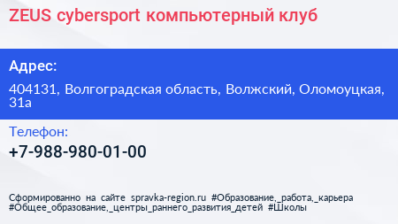 ZEUS cybersport, компьютерный клуб по адресу 404131, Волгоградская область, Волжский, Оломоуцкая, 31а в дальнейшем Организация, размещена в следующих категориях: