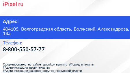 iPixel.ru по адресу 404105, Волгоградская область, Волжский, Александрова, 18а в дальнейшем Организация, размещена в следующих категориях: