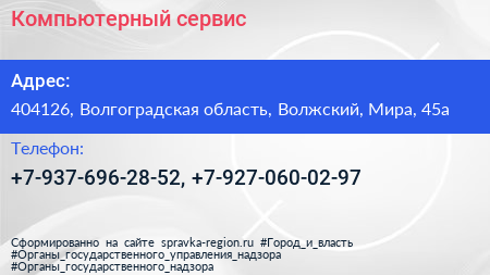 Компьютерный сервис по адресу 404126, Волгоградская область, Волжский, Мира, 45а в дальнейшем Организация, размещена в следующих категориях: