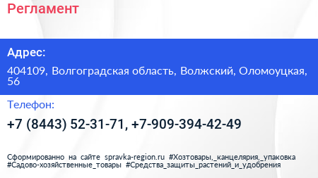 Регламент по адресу 404109, Волгоградская область, Волжский, Оломоуцкая, 56 в дальнейшем Организация, размещена в следующих категориях: