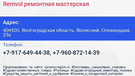 Remvol, ремонтная мастерская по адресу 404105, Волгоградская область, Волжский, Оломоуцкая, 23а в дальнейшем Организация, размещена в следующих категориях: