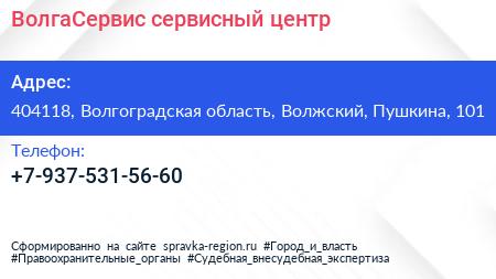 ВолгаСервис, сервисный центр по адресу 404118, Волгоградская область, Волжский, Пушкина, 101 в дальнейшем Организация, размещена в следующих категориях: