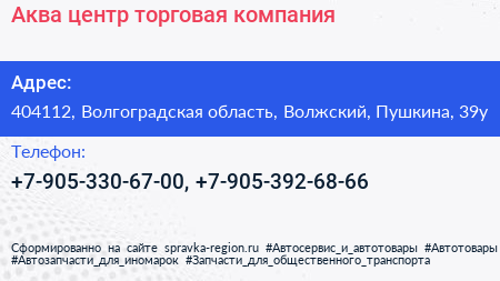 Аква-центр, торговая компания по адресу 404112, Волгоградская область, Волжский, Пушкина, 39у в дальнейшем Организация, размещена в следующих категориях: