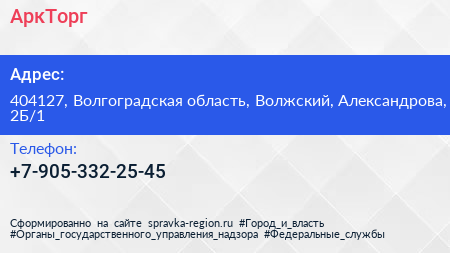 АркТорг по адресу 404127, Волгоградская область, Волжский, Александрова, 2Б/1 в дальнейшем Организация, размещена в следующих категориях: