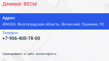 Демиург. ВЕСЫ. по адресу 404104, Волгоградская область, Волжский, Пушкина, 92 в дальнейшем Организация, размещена в следующих категориях: