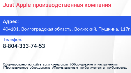 Just Apple, производственная компания по адресу 404101, Волгоградская область, Волжский, Пушкина, 117г в дальнейшем Организация, размещена в следующих категориях: