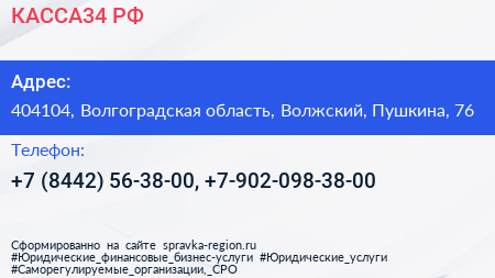 КАССА34.РФ по адресу 404104, Волгоградская область, Волжский, Пушкина, 76 в дальнейшем Организация, размещена в следующих категориях: