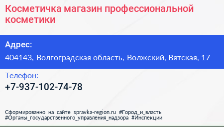 Косметичка, магазин профессиональной косметики по адресу 404143, Волгоградская область, Волжский, Вятская, 17 в дальнейшем Организация, размещена в следующих категориях: