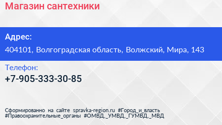 Магазин сантехники по адресу 404101, Волгоградская область, Волжский, Мира, 143 в дальнейшем Организация, размещена в следующих категориях: