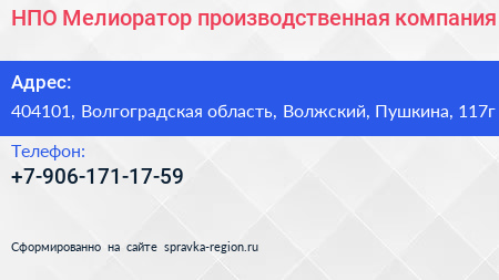НПО Мелиоратор, производственная компания по адресу 404101, Волгоградская область, Волжский, Пушкина, 117г в дальнейшем Организация, размещена в следующих категориях: