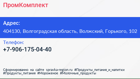 ПромКомплект по адресу 404130, Волгоградская область, Волжский, Горького, 102 в дальнейшем Организация, размещена в следующих категориях:
