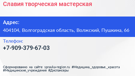 Славия, творческая мастерская по адресу 404104, Волгоградская область, Волжский, Пушкина, 66 в дальнейшем Организация, размещена в следующих категориях: