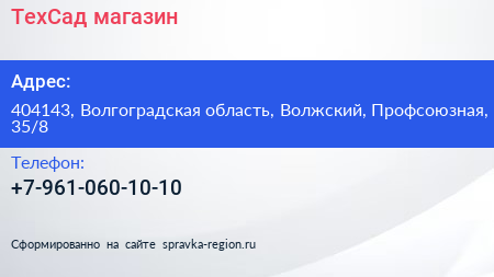 ТехСад, магазин по адресу 404143, Волгоградская область, Волжский, Профсоюзная, 35/8 в дальнейшем Организация, размещена в следующих категориях: