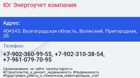 Юг Энергоучет, компания по адресу 404143, Волгоградская область, Волжский, Пригородная, 2Б в дальнейшем Организация, размещена в следующих категориях: