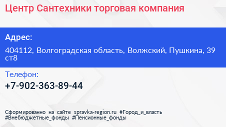Центр Сантехники, торговая компания по адресу 404112, Волгоградская область, Волжский, Пушкина, 39 ст8 в дальнейшем Организация, размещена в следующих категориях: