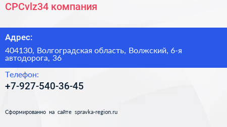 CPCvlz34, компания по адресу 404130, Волгоградская область, Волжский, 6-я автодорога, 36 в дальнейшем Организация, размещена в следующих категориях: